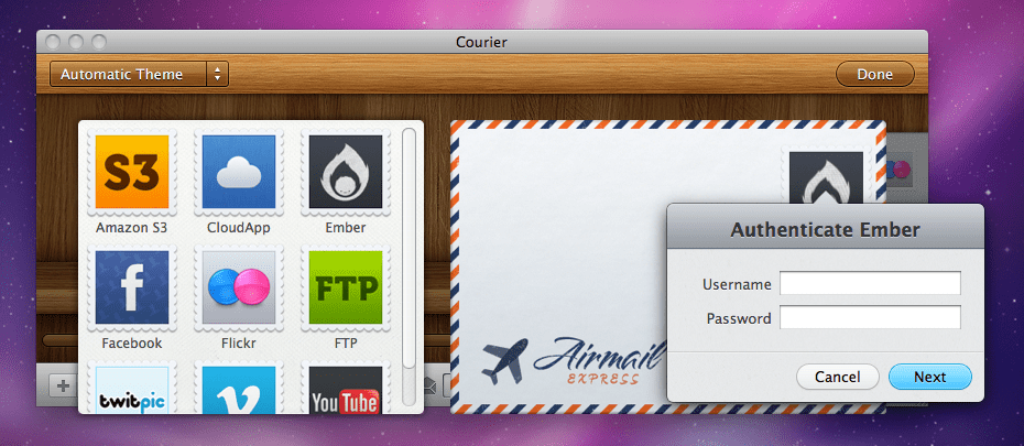 こうして作成されたアップロード設定のセットである封筒は、アップロード先を元に自動でデザインテーマが設定される。このデザインテーマは “.courierEnvelopes” の拡張子を持つプラグインバンドルになっており、あるいは今後追加することも可能になるかもしれない追加するための SDK が製品ウェブサイトでリリースされている。この SDK には Photoshop 用のテンプレートや、プロパティリストの書き方を説明する文書、サンプルのデザインテーマが入っており、デザインテーマに必要な3つの画像を比較的簡単に作ることができる。(2010/09/03 追記)