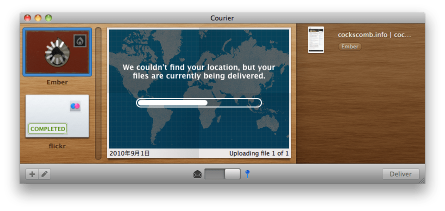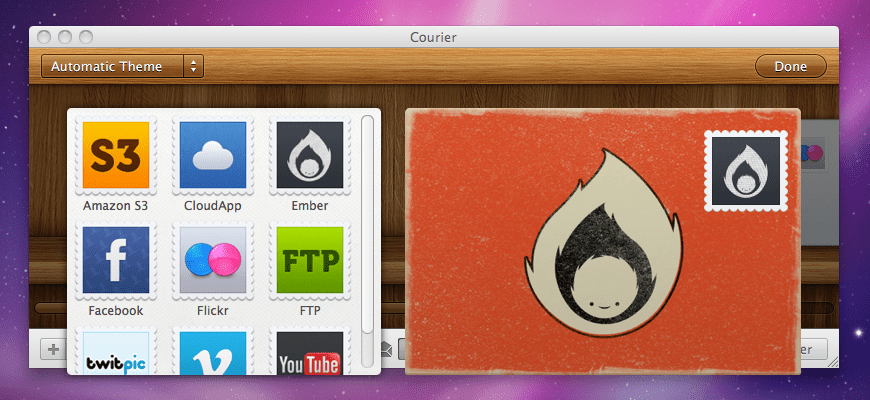 Realmac software から リリースされた “Courier”。「配達人」の名を持つこのアプリケーションは、封筒 (envelope) と切手 (stamp) をモチーフとして、ファイルをオンラインの共有サービスにアップロードする。これまでにも美しいビジュアルの UI を生み出してきた Realmac software が、遊び心いっぱいの UI で送り出した、珠玉のソフトウェアである。