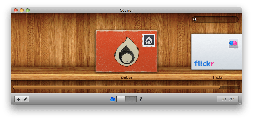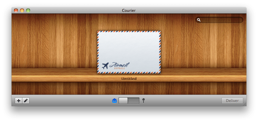 UI は、封筒の並んだ棚をイメージしたものである。棚のモチーフは近年の流行であろうか。また木目調も最近は多く見られる。注目したいのは画面中央下に見られるスイッチ型のコントロールだ。iPhone の標準 UI である UISwitch が登場して以来、この形のコントロールはデスクトップにも普及してきた。Courier ではこれを、封筒のモードと履歴のモードを切り替えるのに用いている。