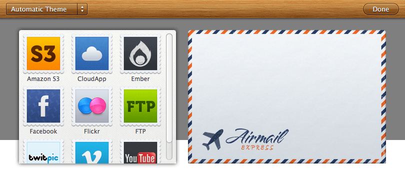 画面には封筒の表側と、サービスを表した切手が並んで表示され、この封筒に切手をドラッグアンドドロップする。はじめてそのサービスを使う際には、切手から吹き出し状の認証画面が表示される。認証できると次はアップロードの設定画面がやはり吹き出し状に表示される。吹き出し状の UI は、コンテキストをはっきりさせる上で十分に有用であり、Apple 自身 iOS における UIPopoverController の形で採用しているほか、多くのアプリケーションで見ることができる。
